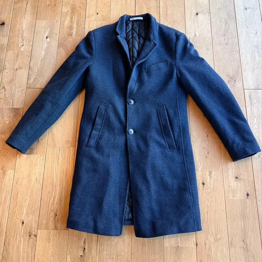 울 혼방 다크 블루 체스터 코트, 퀼팅 안감으로 따뜻함을 제공합니다. - 브랜드: ZARA - 색상: 다크 블루 - 소재: 겉감: 울 혼방, 안감: 퀼팅 - 스타일: 체스터 코트 - 디자인: 싱글 버튼, 포켓 부착 방문해 주셔서 감사합니다. 사이즈 - M 착용 빈도가 높아 사용감이 있지만 아직 사용 가능합니다. 구제 의류에 이해가 있는 분은 잘 부탁드립니다. 클리닝 완료했습니다.