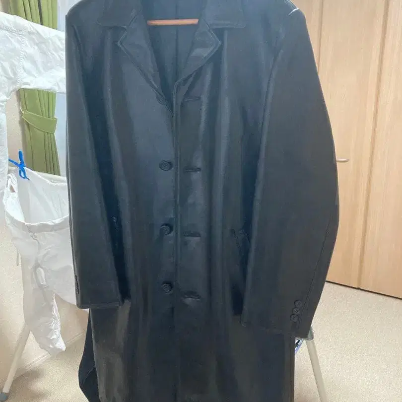 심플하고 엘레강트한 블랙 가죽 롱 코트.