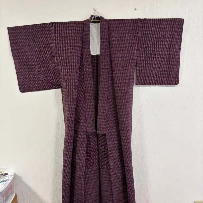 보라색 스트라이프 무늬의 기모노, 안쪽에 작은 얼룩 있음. - 색상: 보라색 - 디자인: 스트라이프 무늬 - 안쪽 상태: 작은 얼룩 있음 기장: 155cm 화장: 56cm 소매 길이: 48cm 소매 폭: 33cm 앞 폭: 37cm 뒷 폭: 29cm 작게 접어서 발송합니다. 방문해 주셔서 감사합니다.