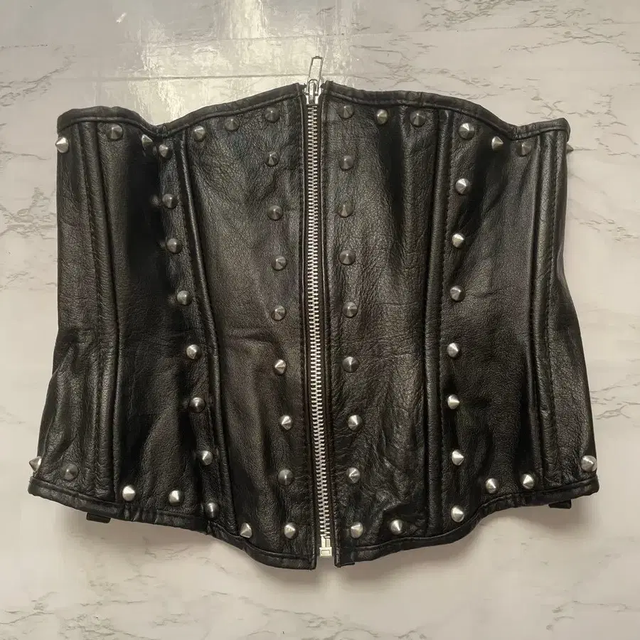 스터드가 달린 블랙 가죽 뷔스티에, 앞면 지퍼와 레이스업 디자인이 특징입니다. 총길이 28cm 가슴 너비 30cm (평평하게 놓았을 때) 택은 제거했지만, 브랜드는 allure Leather입니다. - 색상: 블랙 - 소재: 가죽 - 디자인: 스터드 장식 - 스타일: 레이스업 - 지퍼: 앞면 지퍼 방문해 주셔서 감사합니다.