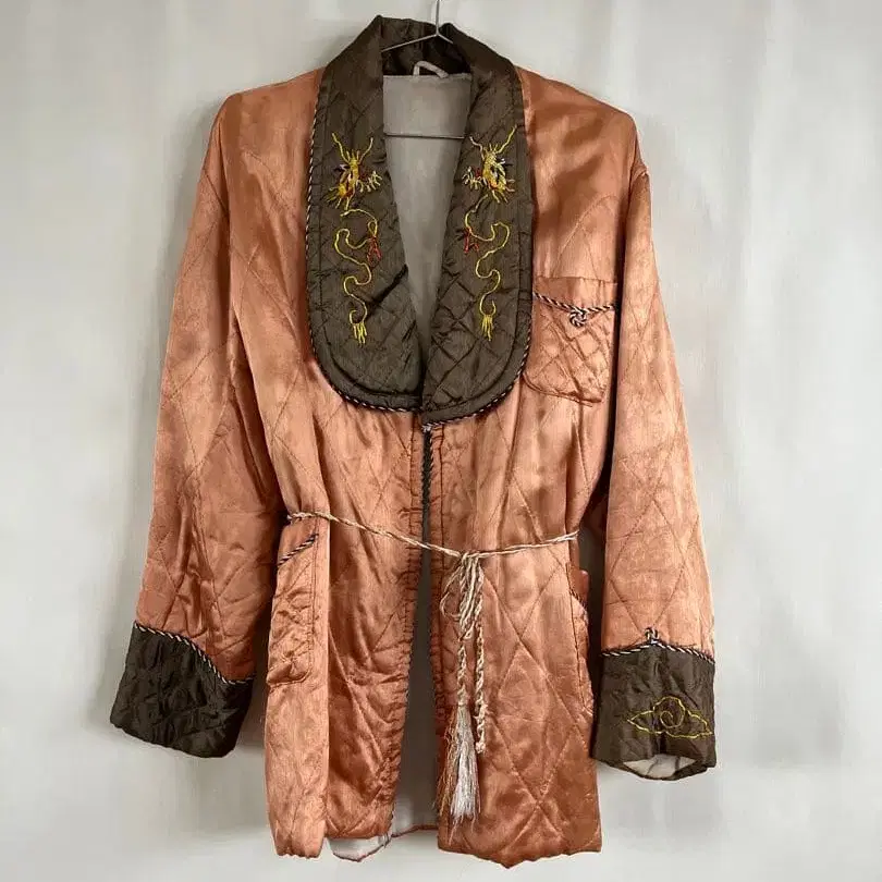 드래곤 자수가 놓인 살몬 핑크와 브라운 색상의 새틴 로브입니다. 상당히 오래되었지만 상태는 좋은 편이라고 생각합니다. 자수 올풀림과 군데군데 얼룩이 있습니다. 매우 희귀한 색상입니다.