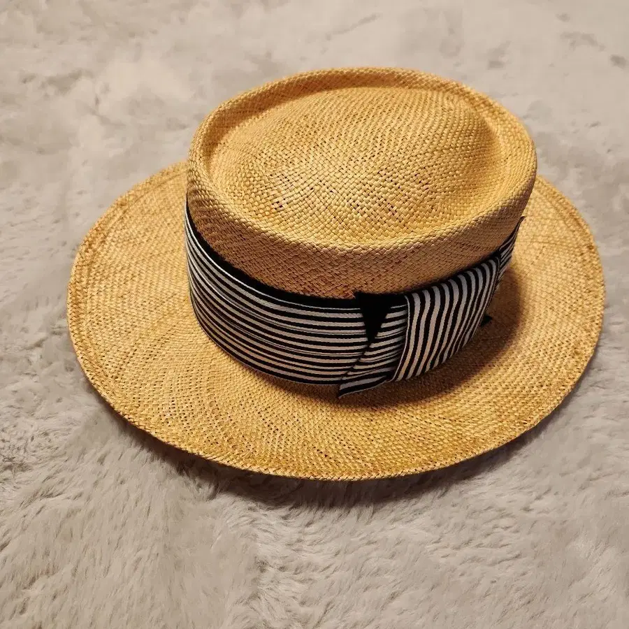 스트라이프 리본 포함 베이지 밀짚모자, 57cm 사이즈.