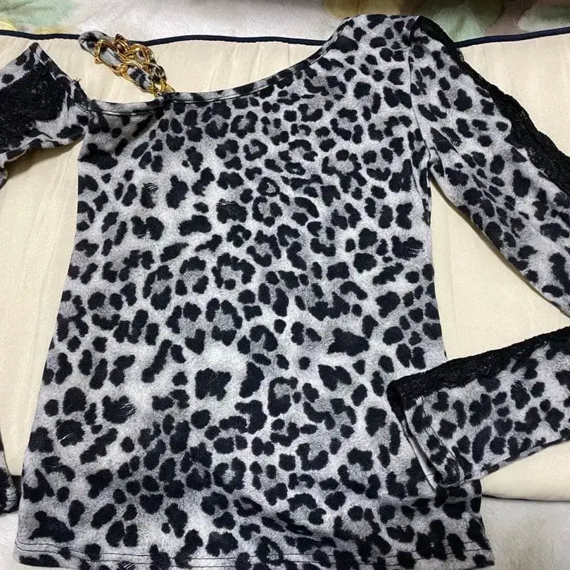 레오파드 무늬 디자인의 플리스 긴팔 상의, 레이스 장식으로 스타일리시합니다. - 디자인: 레오파드 무늬 - 색상: 그레이/블랙 - 소재: 플리스 - 장식: 레이스 포함 - 브랜드: d.i.a. 사이즈 - M 사이즈 - FREE SIZE