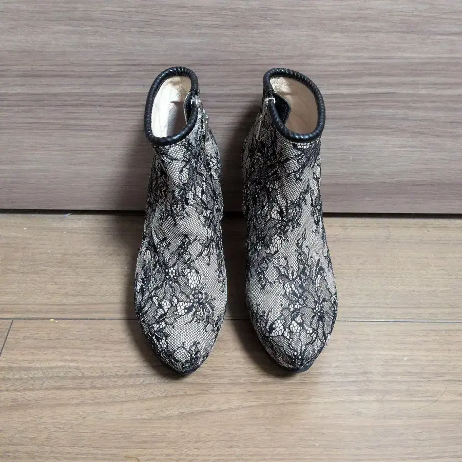 자동 번역되었어요. 원문보기블랙과 베이지 레이스 디자인의 하이힐 앵클부츠.