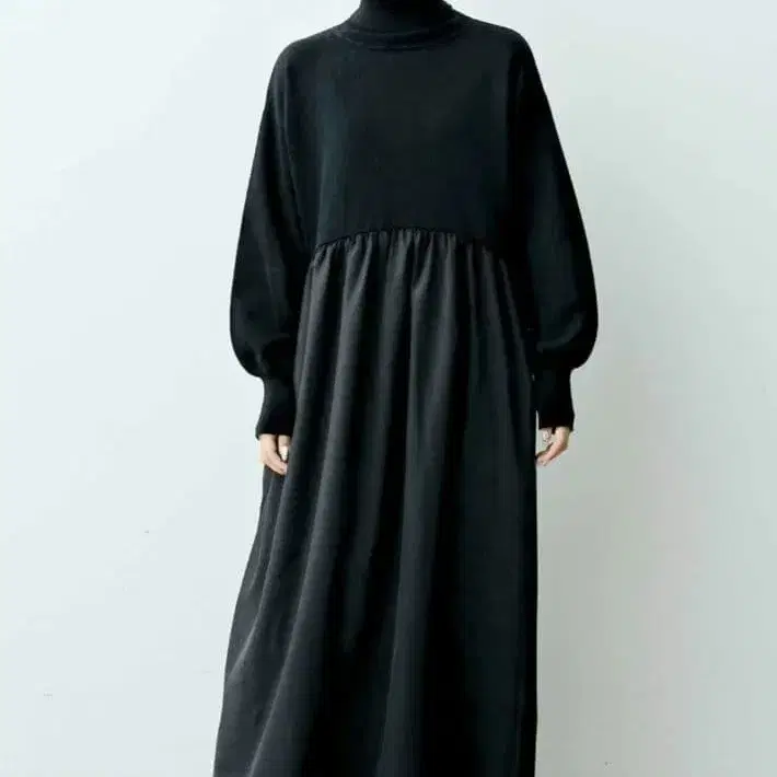 터틀넥 디자인의 블랙 원피스, 도킹 소재로 스타일리시한 인상.