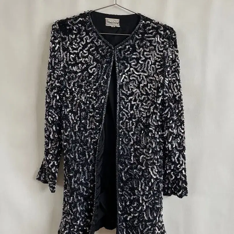 비즈 자수가 놓인 블랙과 실버 색상의 노카라 자켓입니다. 올이 풀린 부분도 있습니다. - 브랜드: Frank Usher - 색상: 블랙/실버 - 디자인: 비즈 자수 - 스타일: 노카라 - 소매 스타일: 긴팔 방문해 주셔서 감사합니다. 사이즈 - FREE SIZE