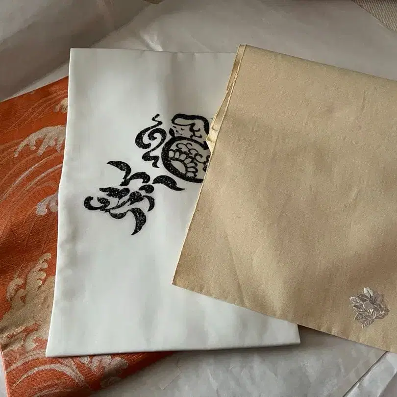 나고야 오비 2점, 여름 후쿠로 오비(오렌지) 1점 묶음 판매입니다. 리메이크용으로 판매하지만, 눈에 띄는 얼룩은 보이지 않으므로 신경 쓰이지 않으시는 분이라면 착용도 가능할 것 같습니다. 또한 여러 점 묶음 구매 시 총액에서 10% 할인해 드리니, 미리 댓글 부탁드립니다. 작게 접어서 발송합니다.