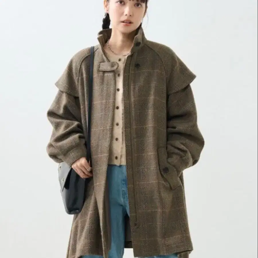 - 색상: 브라운 계열의 체크 무늬 - 디자인: 케이프 스타일의 코트 - 안감: 있음 - 버튼: 앞면에 버튼 부착