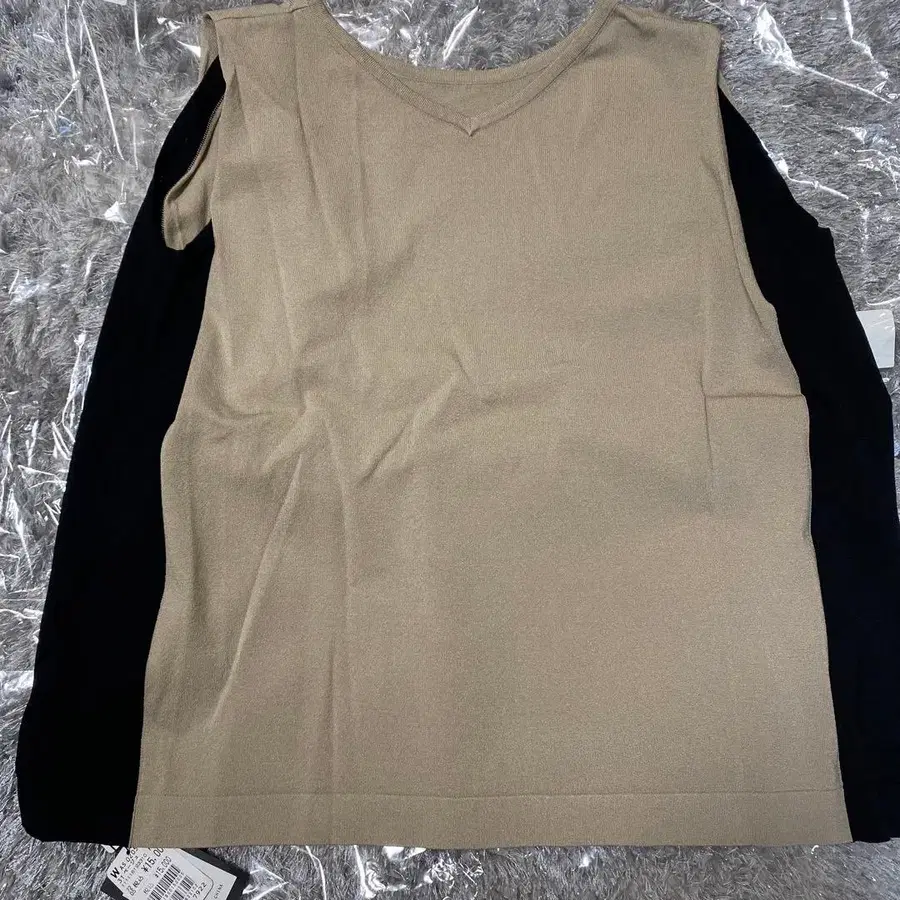 베이지와 블랙의 배색이 특징인 슬리브리스, 사이즈 F로 스타일리시한 디자인. - 색상: 베이지와 블랙 - 가격: 15,000엔 - 사이즈: F 방문해 주셔서 감사합니다. 사이즈 - FREE SIZE