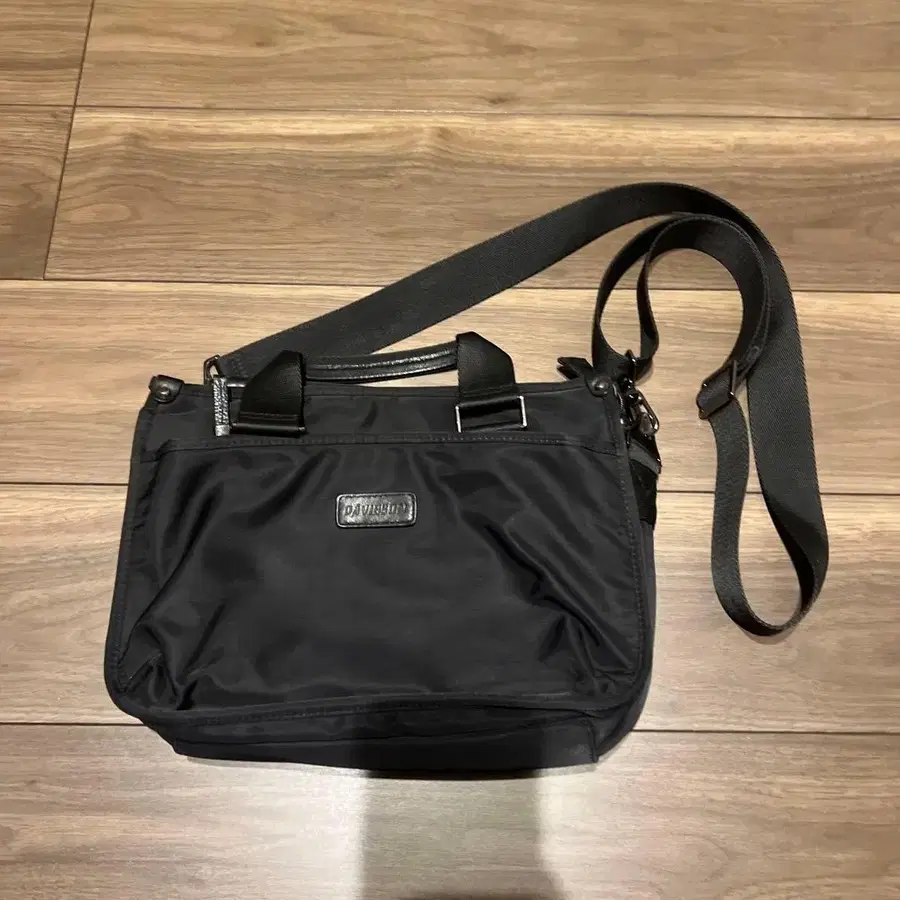 나일론 소재의 블랙 숄더백으로, 내부 포켓이 있습니다.