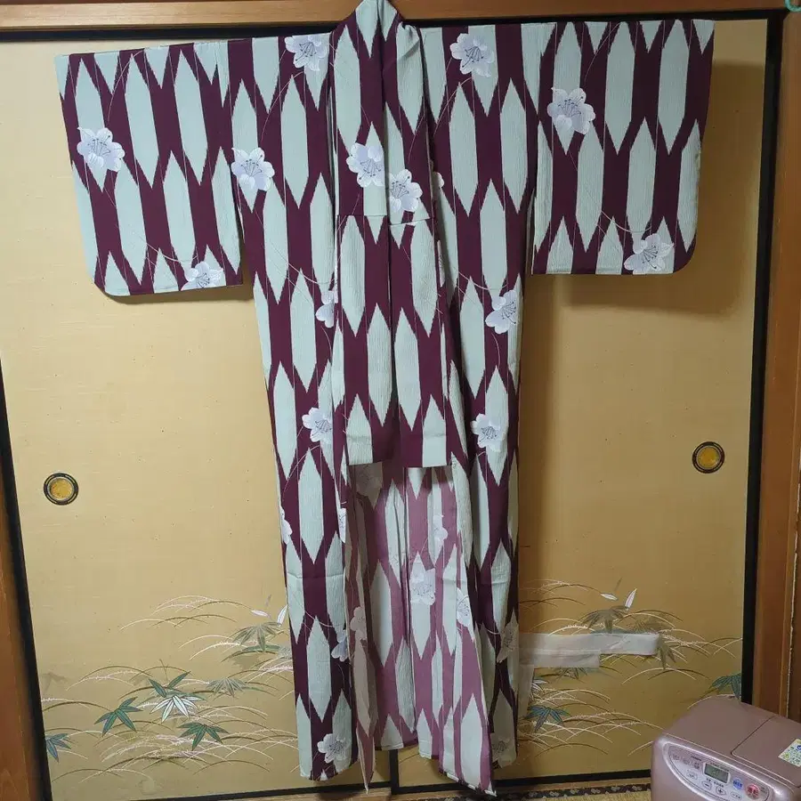 코몬 기모노 적자색 연한 녹색 꽃무늬 단의 워셔블 기모노 동양 일본 의류