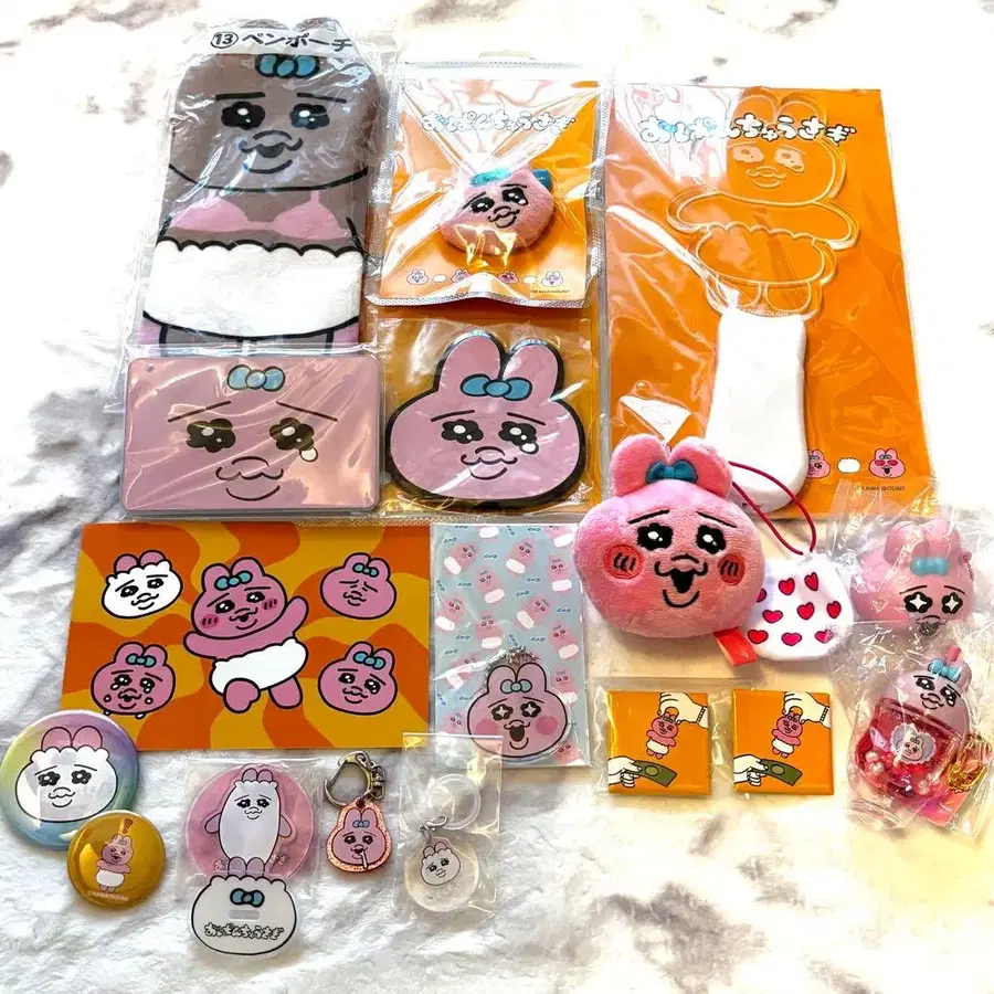 빤쮸토끼 굿즈 세트입니다. 응원봉 펜 파우치 러버 코스터 인형 배지 슬라이드 카드 케이스 아크릴 키링 마스코트 스트랩 배지 4개 엽서 컬러풀 소다 키링 피치 키링 메지루시 액세서리 스퀴즈 키링 개봉 완료된 것도 있지만, 대부분 미사용입니다. 즉시 구매 ⭕️