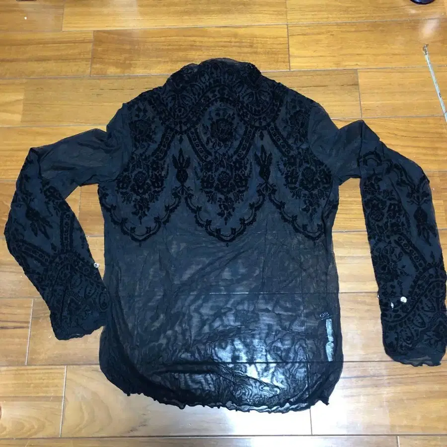 비침이 있는 블랙 긴팔 셔츠, 자수 장식 디자인.