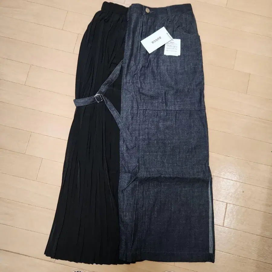 블랙 플리츠와 데님 콤비네이션, 캐주얼에도 엘레강트에도 사용하기 쉬운 디자인.