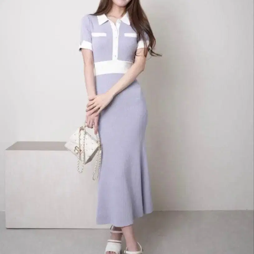 새상품 립서비스 프론트 버튼 바이컬러 머메이드 원피스 라벤더