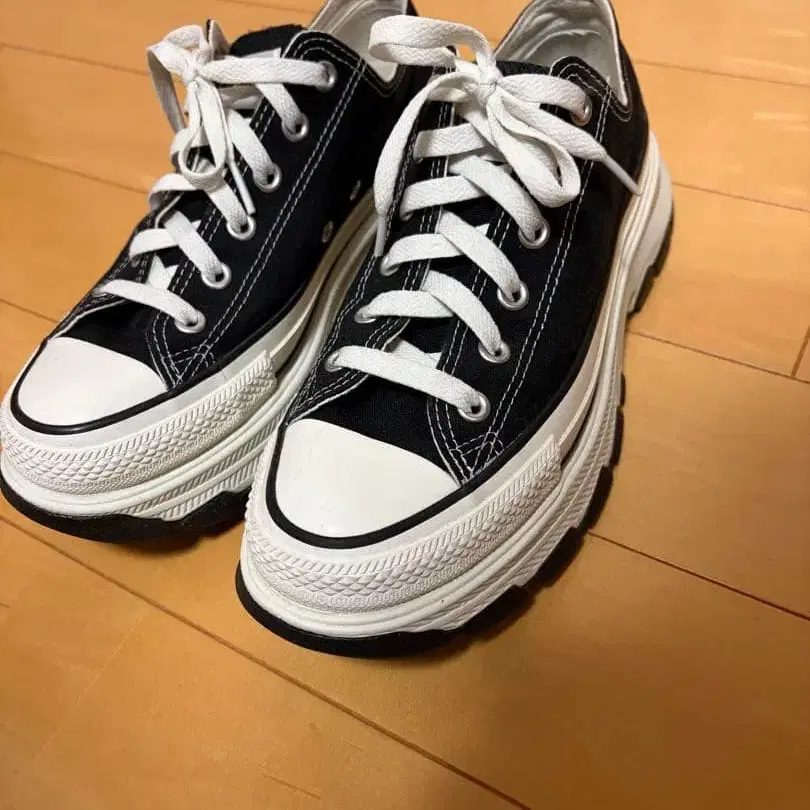 방문해 주셔서 감사합니다. 통굽 캔버스 스니커즈, 블랙/화이트. - 브랜드: CONVERSE - 모델명: ALL STAR - 색상: 블랙/화이트 - 디자인: 로우컷 - 소재: 캔버스 - 밑창: 러버 - 특징: 통굽 ● 사이즈 26cm ● 상태: 2~3회 착용했지만 눈에 띄는 얼룩은 없습니다. ● 기타, 주의 사항: 자세한 디자인은 사진으로 확인해 주세요. 프로필을 봐주시면 감사하겠습니다.