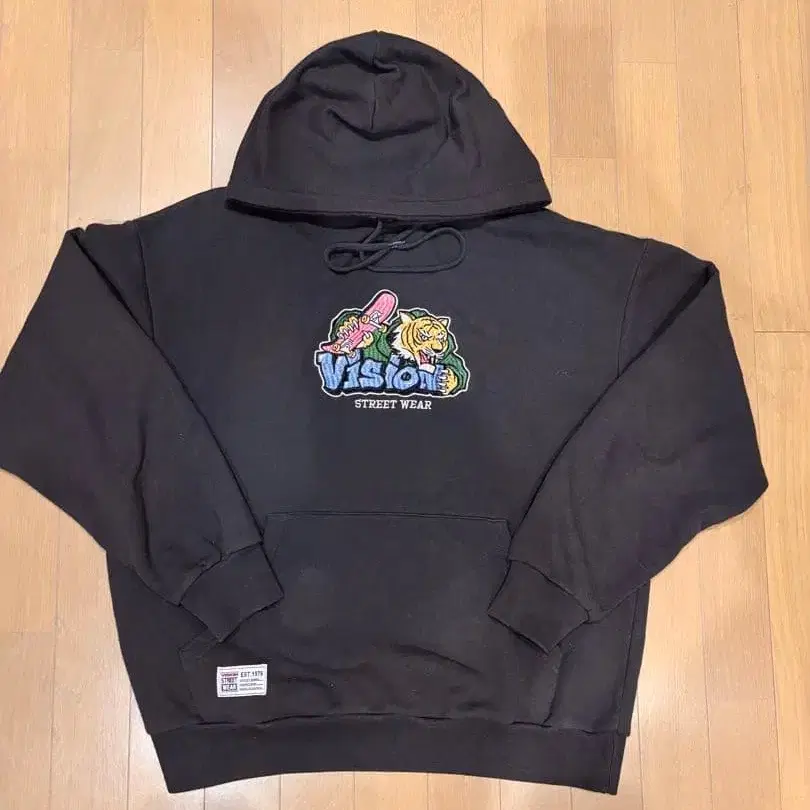자수 로고가 특징인 블랙 후드티. - 브랜드: Vision - 스타일: 후드티 - 색상: 블랙 - 디자인: 자수 로고 ( 호랑이와 스케이트보드 ) 방문해 주셔서 감사합니다.