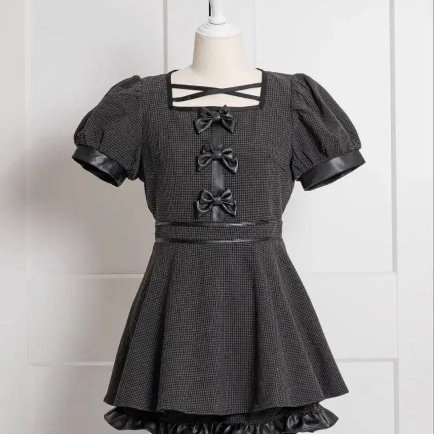 pium 바이컬러 가죽 리본 셋업 깅엄 체크