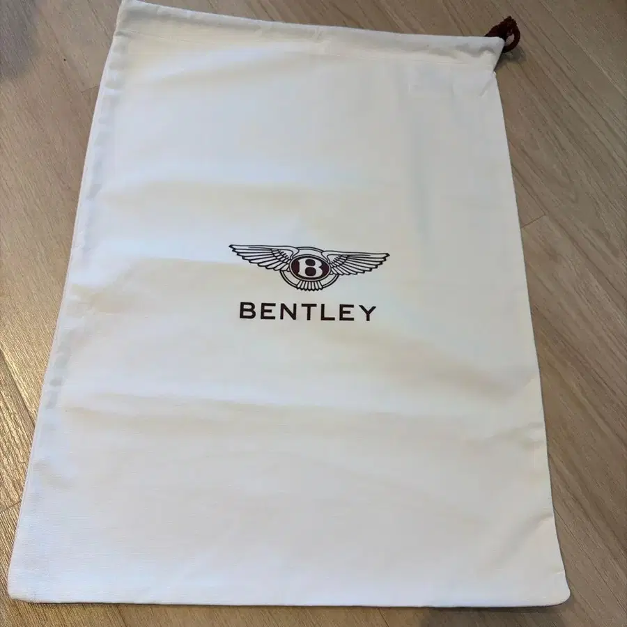 고급스러운 화이트 패브릭 소재 백, Bentley 로고와 끈 포함 디자인.