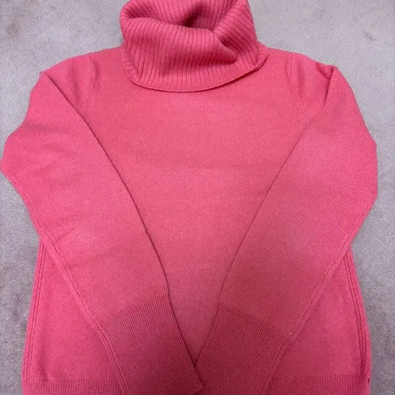 2~3회 착용했습니다. 이후 클리닝하여 보관 중입니다. 색상은 예쁜 핑크이며, 넥 부분은 포근한 터틀넥, 캐시미어 100% 스웨터입니다. 7~8번째 사진처럼 원래 털실이 검은 부분이 있습니다. 기장 52cm 겨드랑이 밑 38cm