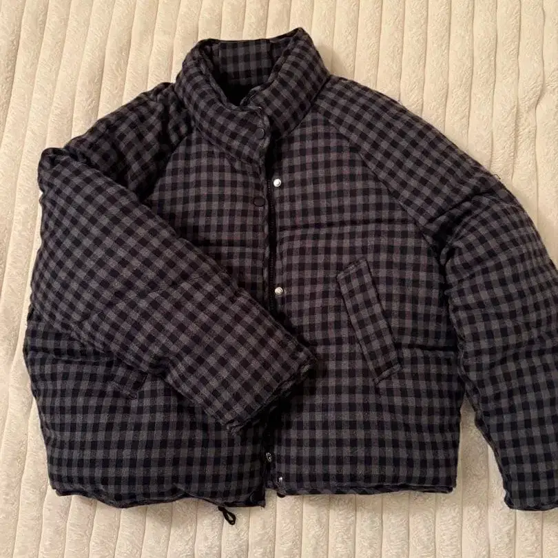 네이비와 그레이 체크 무늬의 다운 자켓입니다. 사이즈가 맞지 않아 판매합니다.