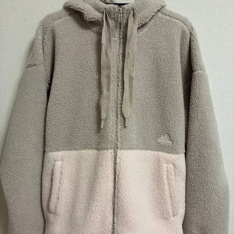 베이지와 핑크 색상이 귀여운 복슬복슬한 플리스 자켓입니다. 따뜻하게 입을 수 있을 뿐만 아니라 매우 가볍고 착용감도 좋습니다. 밑단에 드로 코드가 부착되어 있습니다.