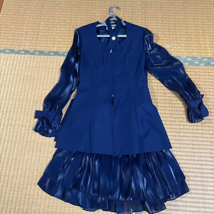 세레모니에 사용할 수 있는 고급 트위드 자켓과 플리츠 스커트 세트