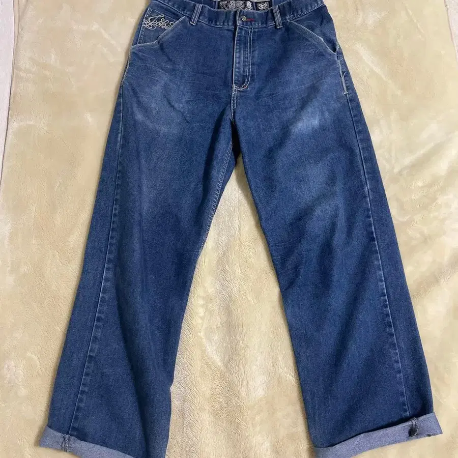자수가 들어간 백 포켓의 블루 스트레이트 데님.