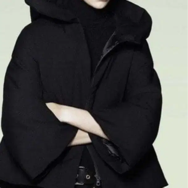 후드 부착 박스 실루엣의 블랙 다운 자켓.