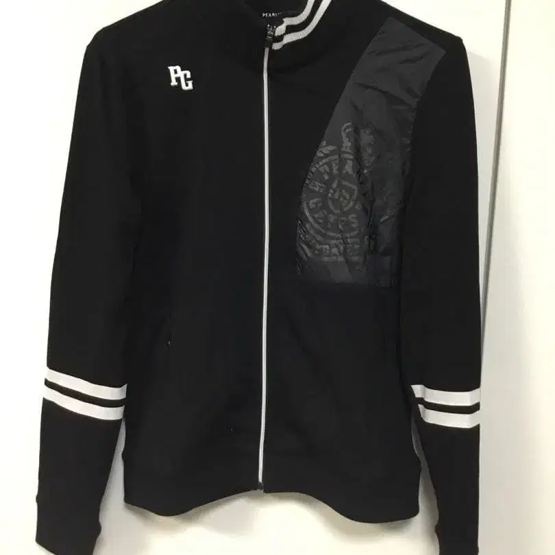지퍼가 달린 블랙 자켓, PG 로고와 그래픽 디자인이 특징.
