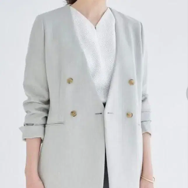 자동 번역되었어요. 원문보기라이트 그레이 노카라 더블 버튼 자켓, 사이드 포켓이 있어 스타일리시한 디자인입니다.