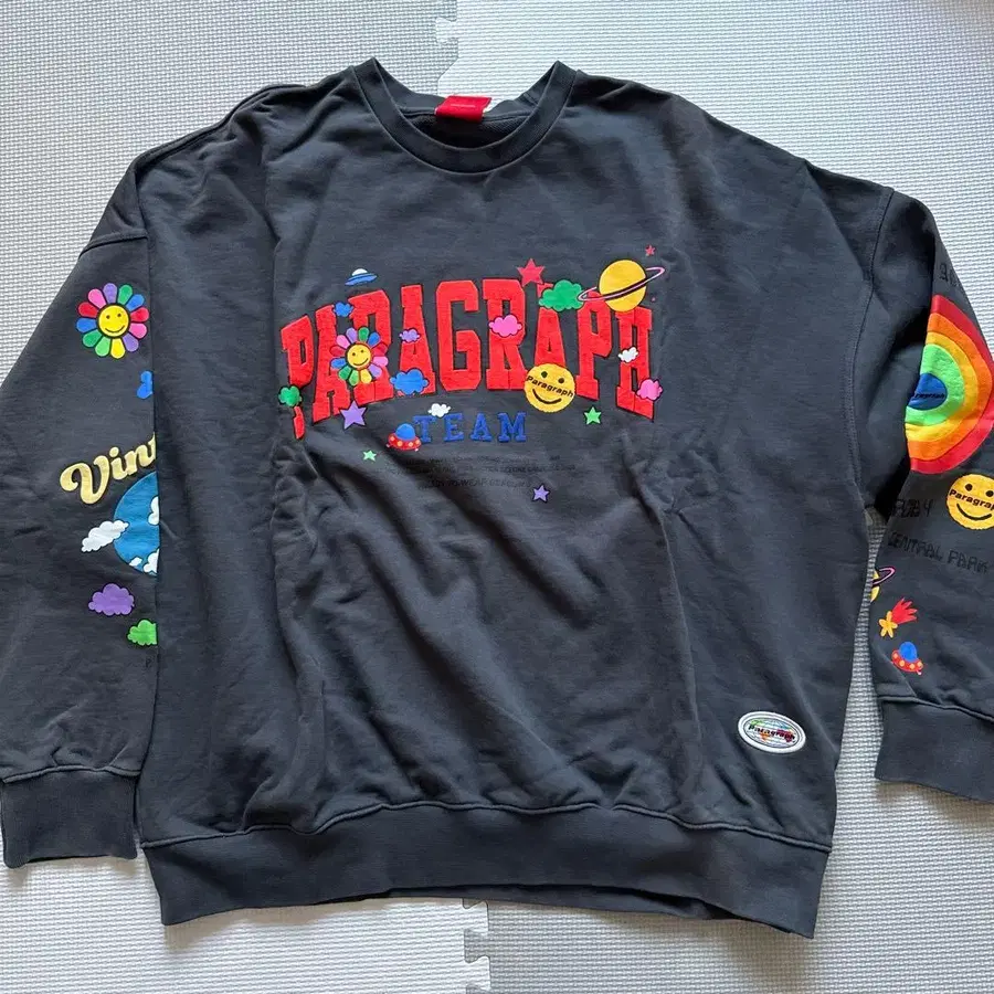 컬러풀한 그래픽이 특징인 코튼 100% 트레이닝복. 몇 번 착용 후 보관했습니다. 착용 기회가 없어 판매합니다. 접어서 보관했기 때문에 약간의 주름이 있습니다. - 브랜드: Paragraph - 색상: 그레이 - 디자인: 컬러풀한 그래픽 프린트 - 소재: 코튼 100% - 스타일: 크루넥 - 특징: 양쪽 소매에 디자인 있음 방문해 주셔서 감사합니다.