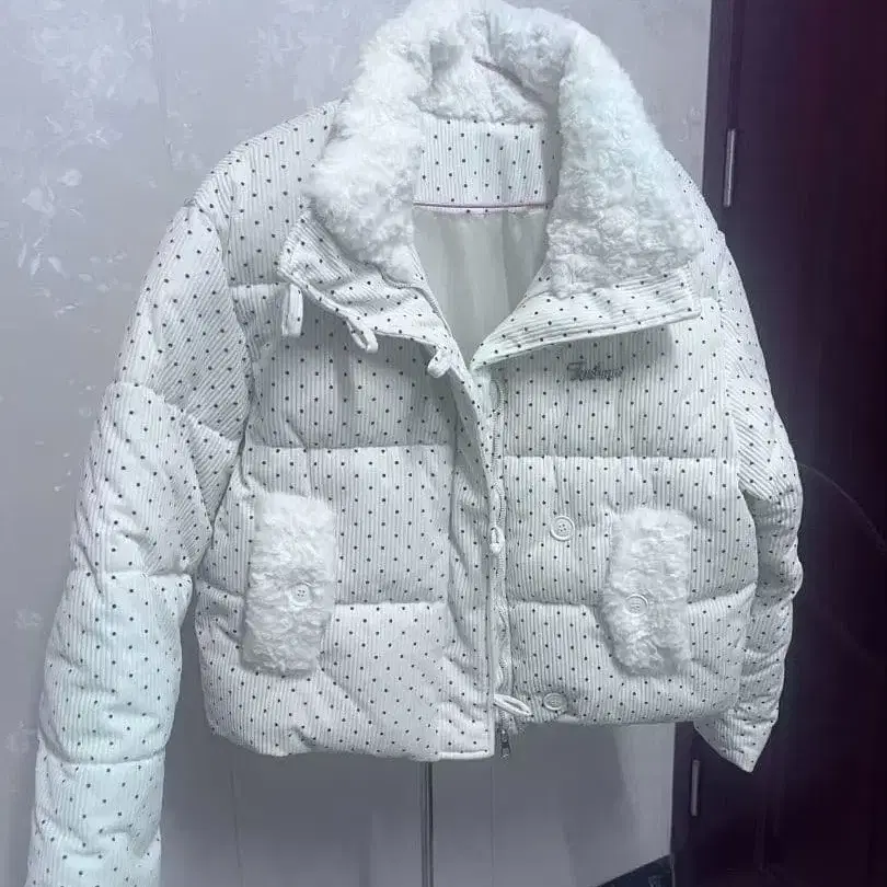 화이트 도트 무늬 숏 기장 다운 자켓 (퍼 포함 캐주얼)