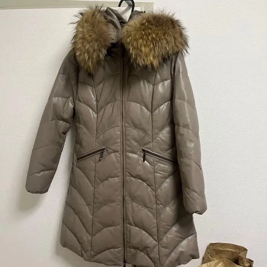 베이지 다운 자켓 퍼 달린 너구리 털 롱 코트