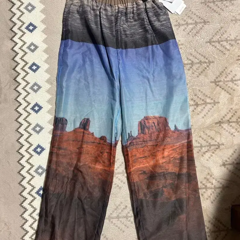 풍경 프린트의 경량 와이드 팬츠, 허리밴딩으로 쾌적한 착용감.