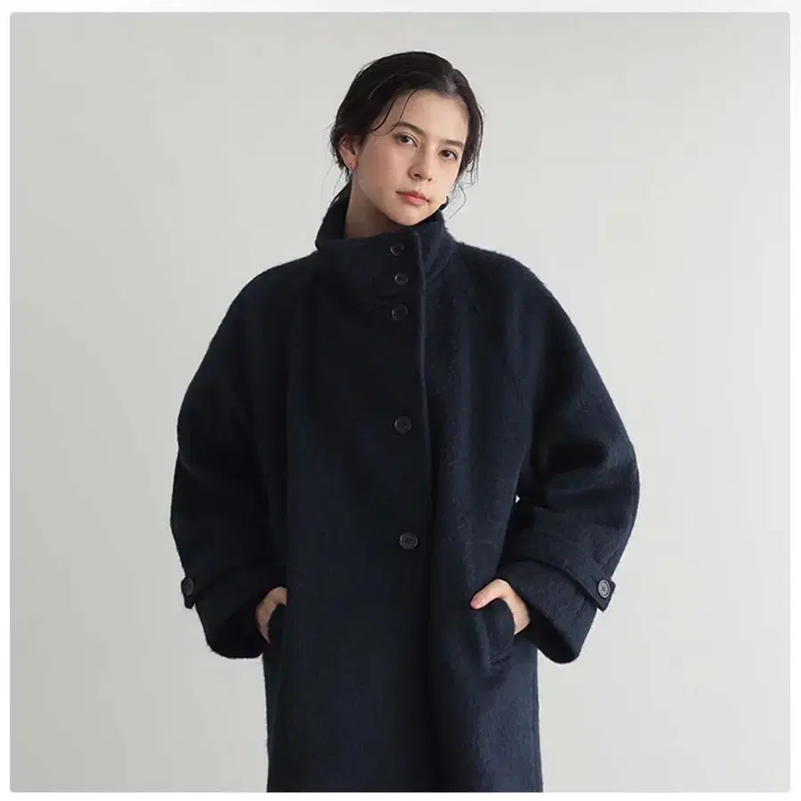 자동 번역되었어요. 원문보기네이비 하이넥 롱 코트, 버튼이 있고 뒷면에 슬릿이 있습니다.
