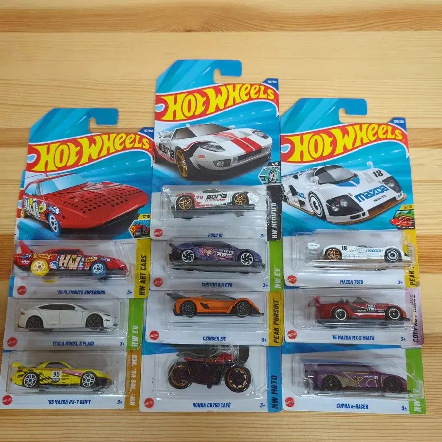 다채로운 디자인의 핫휠 미니카 세트. - 모델명: '70 Plymouth Superbird - 모델명: Ford GT - 모델명: '70 Mazda Mx-5 Miata - 모델명: Custom Kia EV6 - 모델명: Tesla Model S Plaid - 모델명: '94 Mazda RX-7 Drift - 모델명: Cupra e-Racer - 모델명: Honda Cb750 Cafe' - 모델명: Czinger 21C - 모델명: MAZDA 787B 방문해 주셔서 감사합니다. 모두 미개봉 낱개 판매 불가 종류 - 베이직카 스케일 - 1/64 종류1 - 외국 자동차 제조사/국가 - 미국