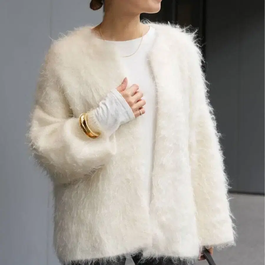 특수 융모 가공으로 퍼처럼 화려하게 마무리한 가디건입니다.