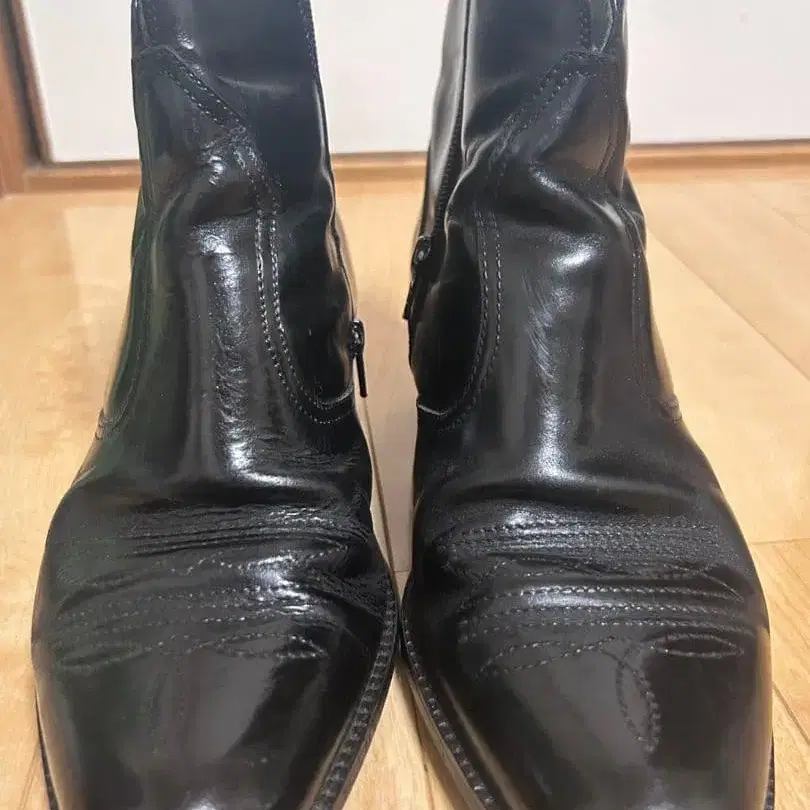 슬립온 스타일의 블랙 가죽 웨스턴 부츠, 중간 굽으로 스타일리시한 디자인.
