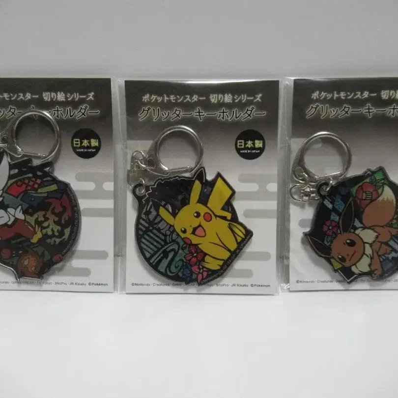 포켓몬스터 종이 공예 시리즈 글리터 키링 3세트 에이스번, 피카츄, 이브이입니다.