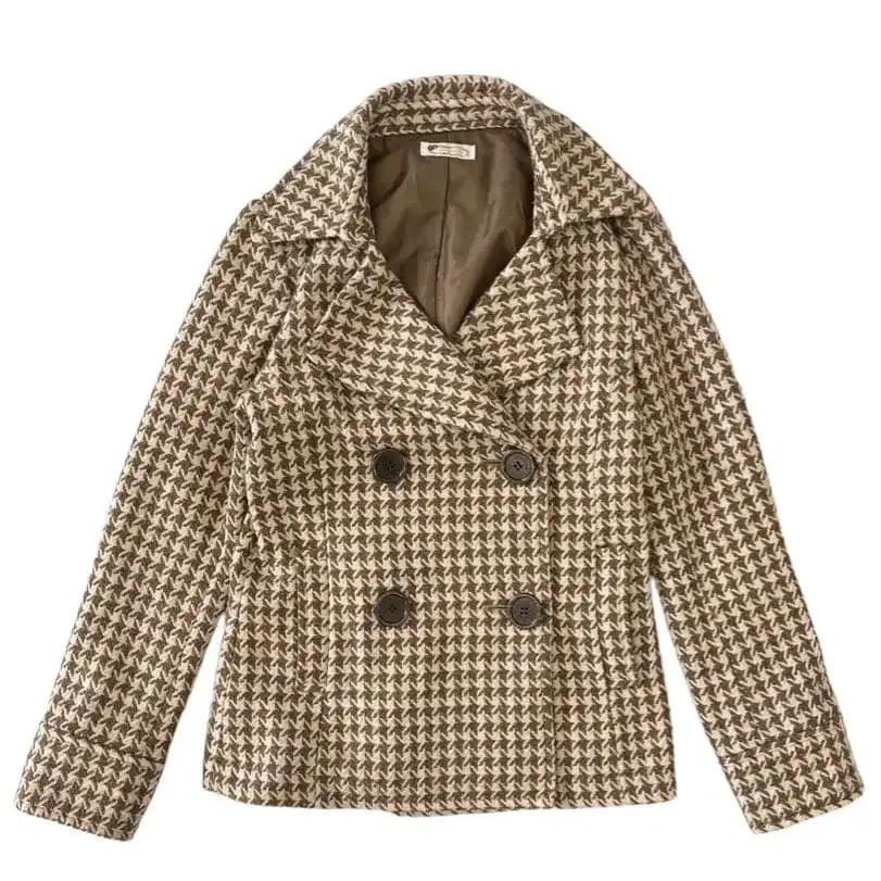 하운드 투스 패턴의 더블 브레스트 자켓, 브라운 계열로 스타일리시한 인상.