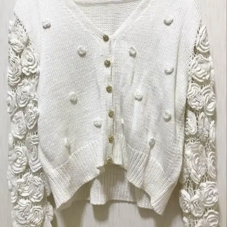 꽃무늬 자수가 놓인 화이트 니트 가디건, V넥 디자인에 골드 컬러 버튼이 달려 있습니다.