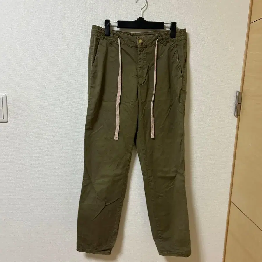 올리브 그린 슬림핏 치노 팬츠, 드로우 스트링으로 쾌적한 착용감. - 색상: 올리브 그린 - 디자인: 드로우 스트링 포함 - 포켓: 백 포켓 있음 - 스타일: 슬림핏 방문해 주셔서 감사합니다. 사이즈 - M