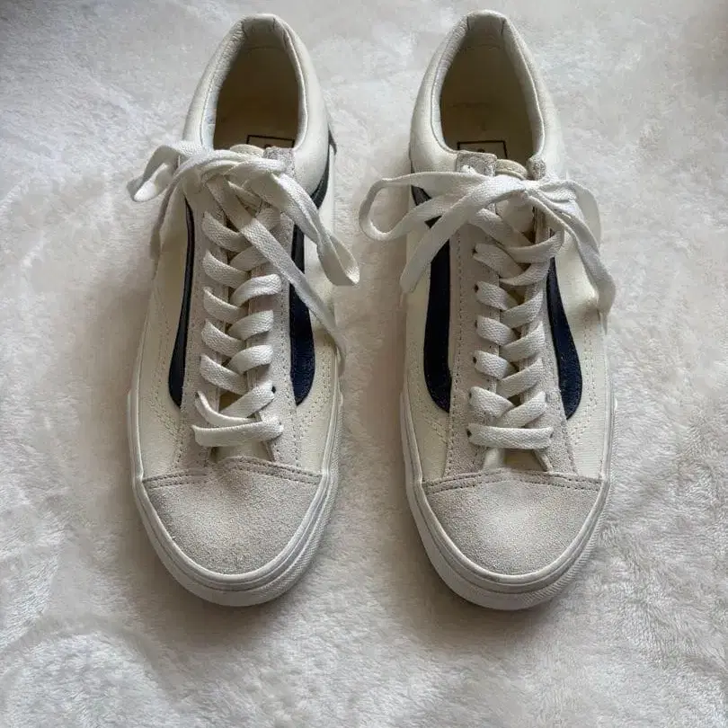 화이트와 네이비 색상의 스웨이드 및 캔버스 소재 스니커즈. 많이 신지 않아 깨끗합니다. - 브랜드: Vans - 색상: 화이트/네이비 - 스타일: 스니커즈 - 특징: 오프 더 월 로고 - 소재: 스웨이드/캔버스 방문해 주셔서 감사합니다. 사이즈 - 26cm