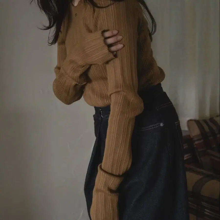 mideal 롱 슬리브 리브 니트 다크 브라운