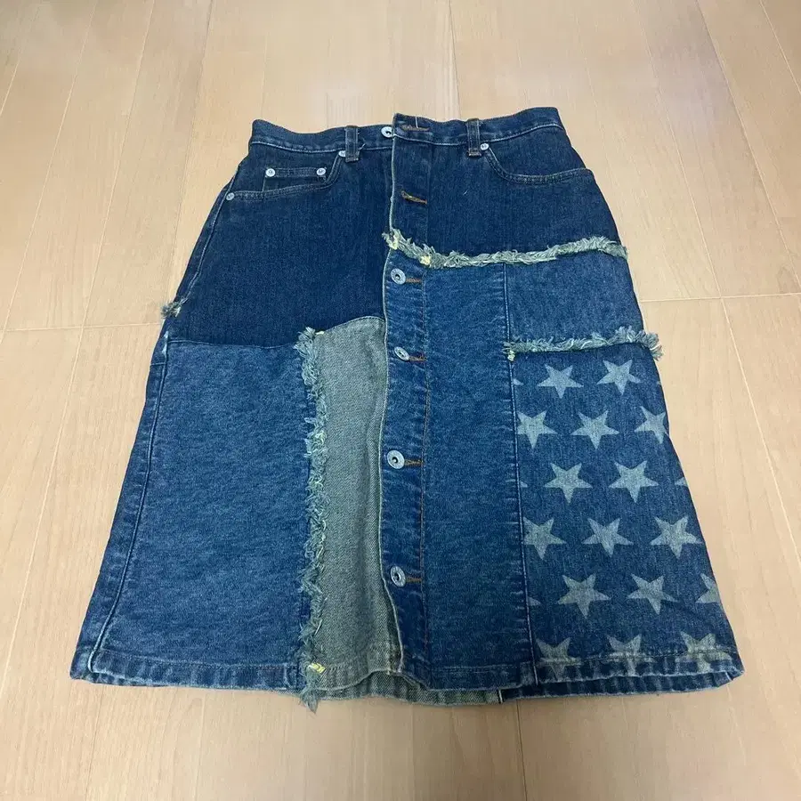 유니크한 패치워크 디자인의 데님 롱 스커트. - 디자인: 패치워크 데님, 별 패턴 - 스타일: 롱 스커트 - 소재: 데님 - 포켓: 백 포켓 있음 - 버튼: 프론트 버튼 있음 - 사이즈: 허리 64 방문해 주셔서 감사합니다.