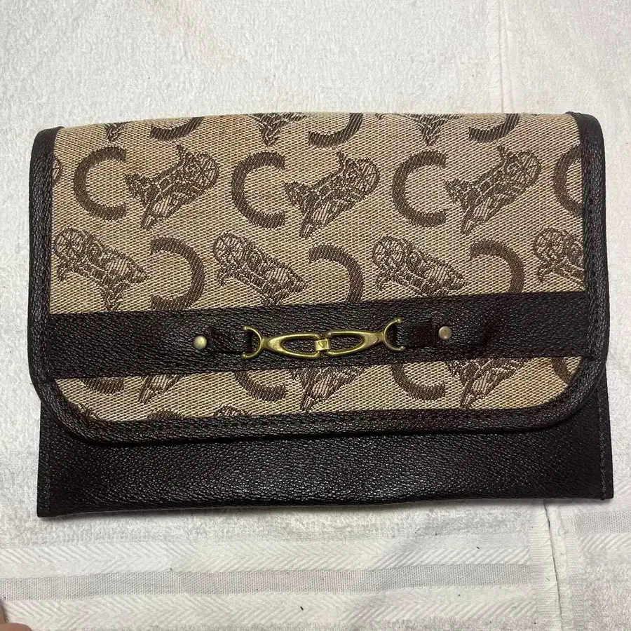 로고가 들어간 캔버스와 가죽 소재의 플랫 클러치백.