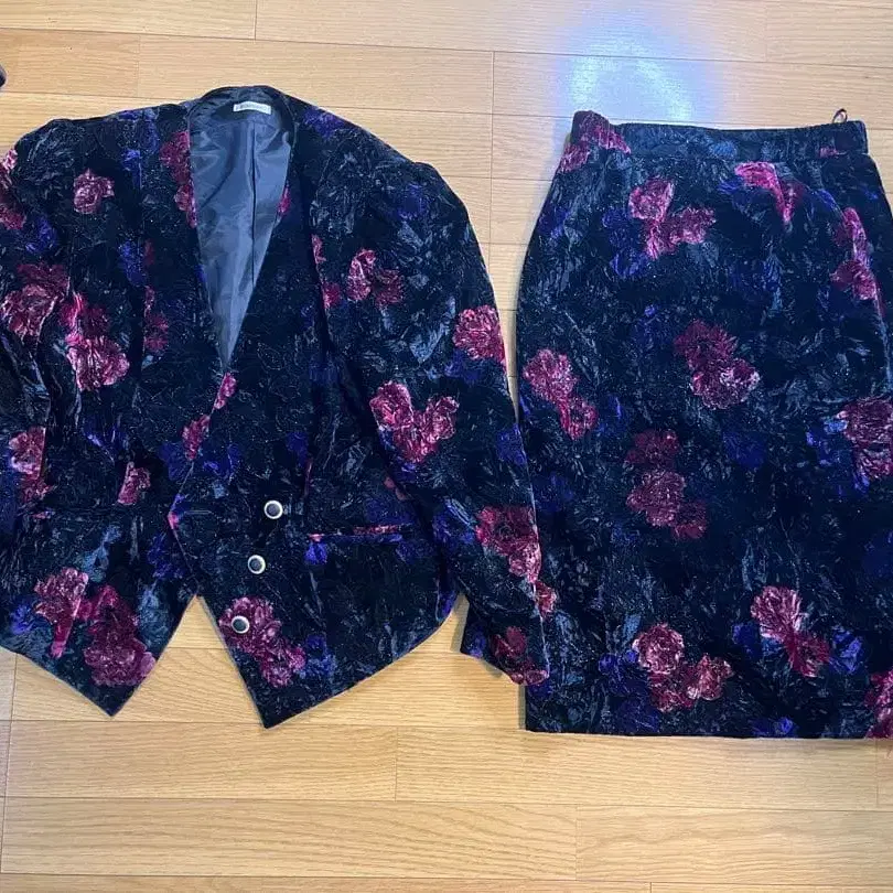블랙과 빨간색 꽃무늬의 벨벳 소재로, 자켓과 스커트 셋업입니다. 12/26 - 브랜드: Kurusa - 색상: 블랙과 빨간색 꽃무늬 - 소재: 벨벳 - 스타일: 자켓과 스커트 세트 - 디자인: 플라워 프린트 방문해 주셔서 감사합니다.