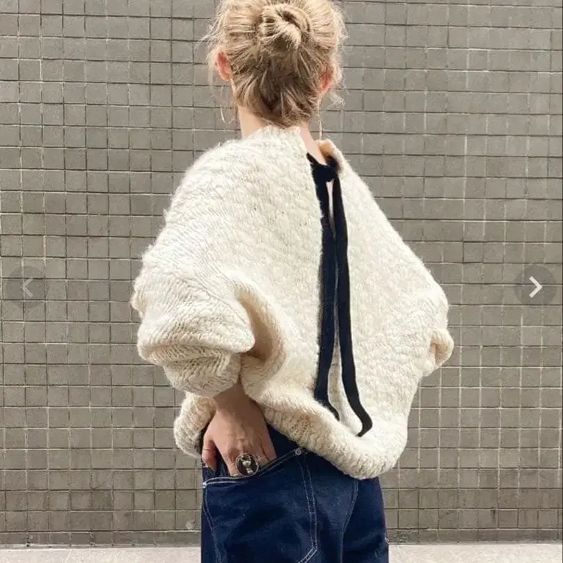 뒷면에 리본이 특징인 아이보리 니트 스웨터.