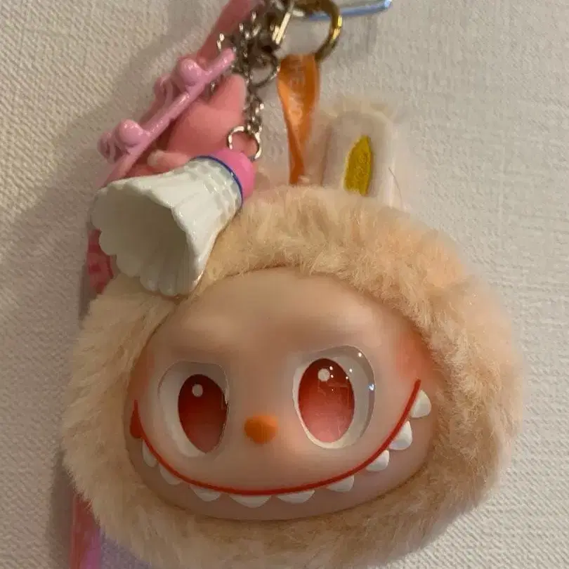 귀여운 캐릭터 얼굴이 특징인 퍼 스트랩, 배드민턴 셔틀콕 포함. - 캐릭터: 귀여운 캐릭터 얼굴 - 색상: 베이지, 핑크 - 소재: 퍼, 플라스틱 - 액세서리: 배드민턴 셔틀콕, 스트랩 포함 - 디자인: 유니크한 디자인의 스트랩 몇 번 사용함 방문해 주셔서 감사합니다.